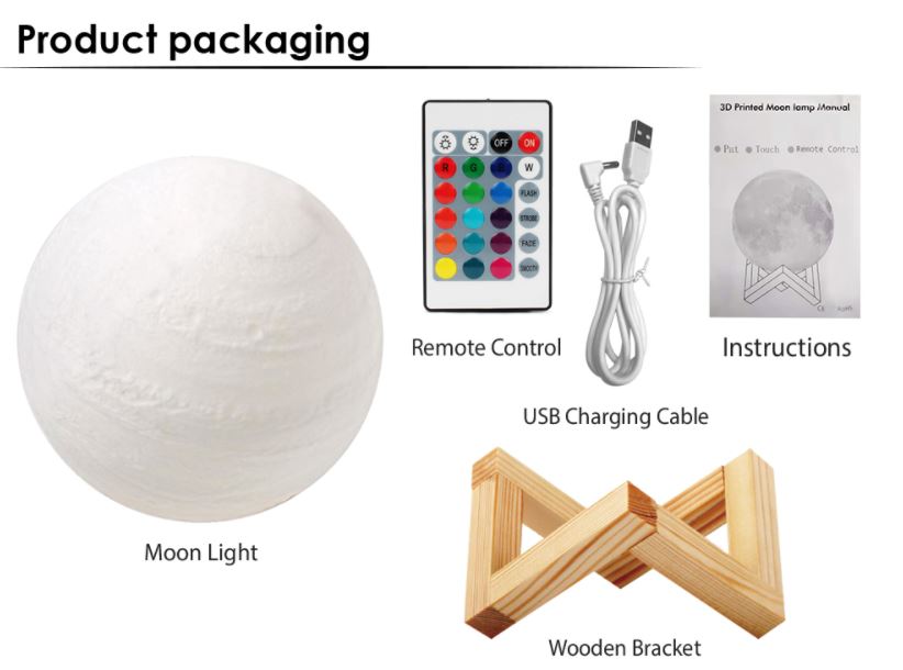 Illuminious and Galactic Moon Lamp comes with a wooden stand and remote control.